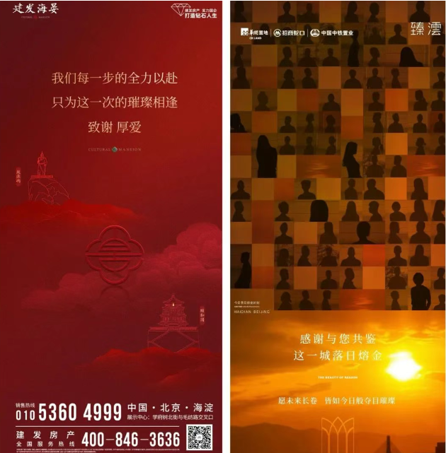 对比两者的海报,建发主打的是真诚感谢;华润置地主打的是浪漫邀请。